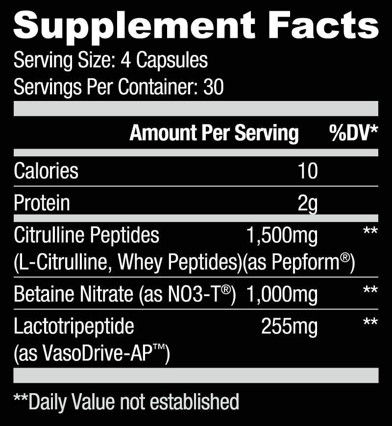- 1.5G of Pepform® Citrulline Peptides for highest bioavailability, studies show equivalent to or more effective than 3G of pure L-Citrulline.